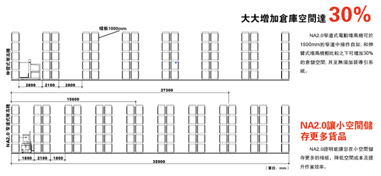*在一般的伸臂式堆高機(jī)2.7公尺的作業(yè)場合中,NA2.0可提高20%的工作效率。