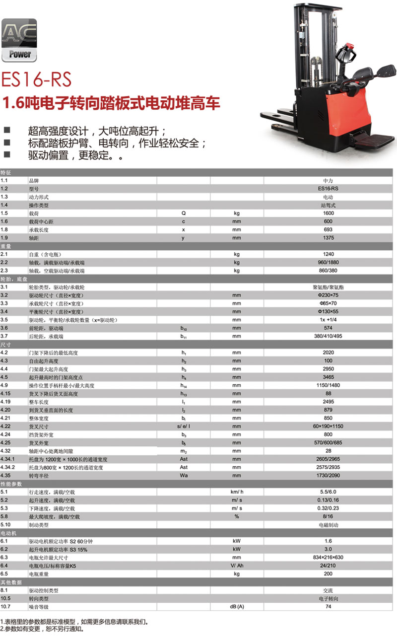 中力電動(dòng)叉車,1.6噸電子轉(zhuǎn)向踏板式電動(dòng)堆高車ES16-RS